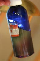 いろいろ実験してみましたが、サンプル作成用に使ったブルーPETボトル125ml入に入れると、なぜか虹色に見えるんですね。(ちなみに商品に利用しているガラス瓶ではレインボーが見えないようです…) 光の屈折率との兼ね合いなのでしょうが、科学的な理由は、理系博士の夫ラースにも説明できないそうです。
